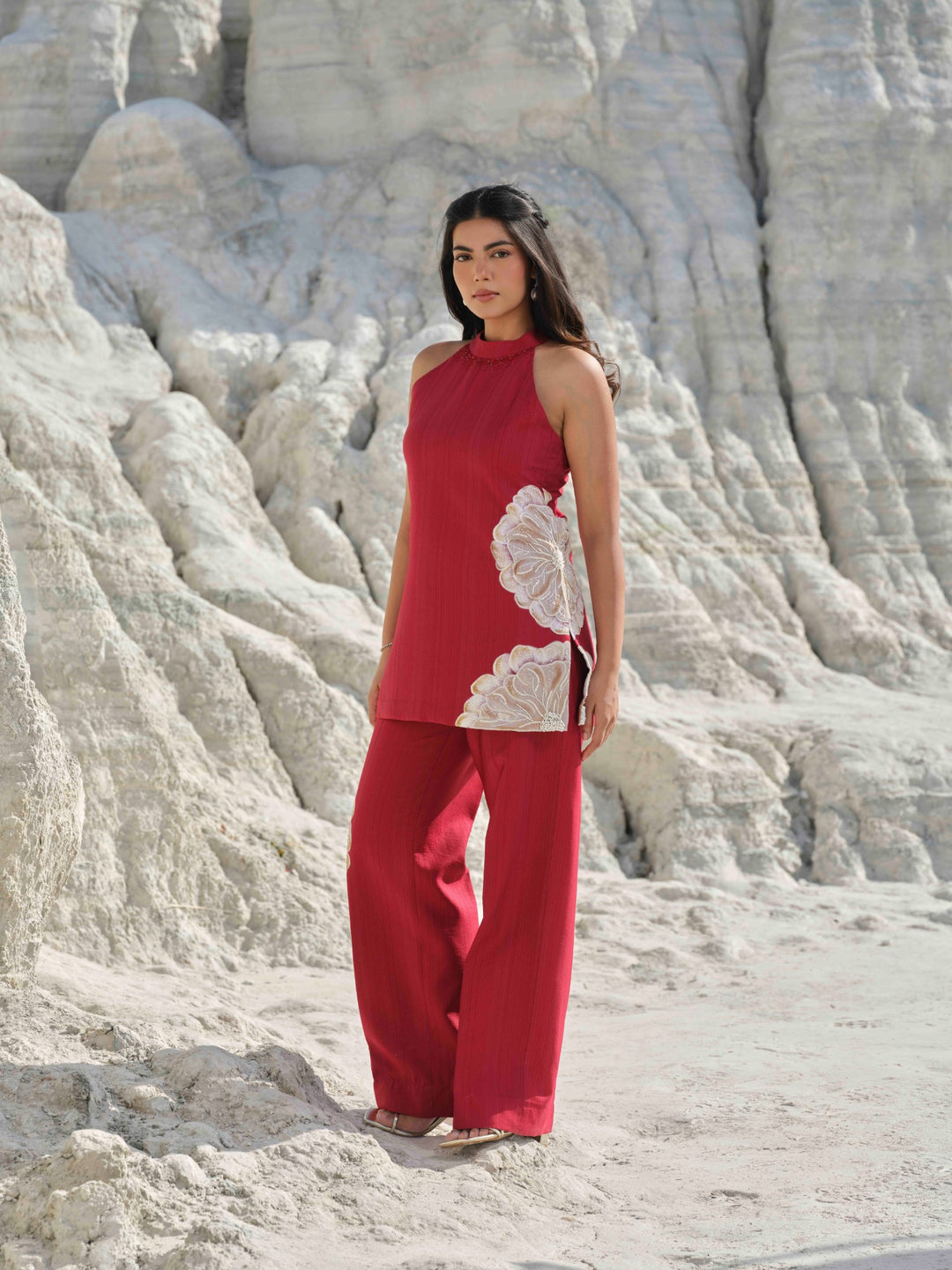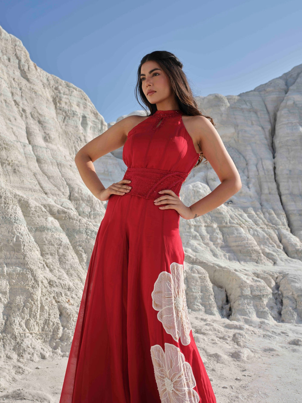Scarlet Bloom - Red Halter Gown With Embellished Corset Belt