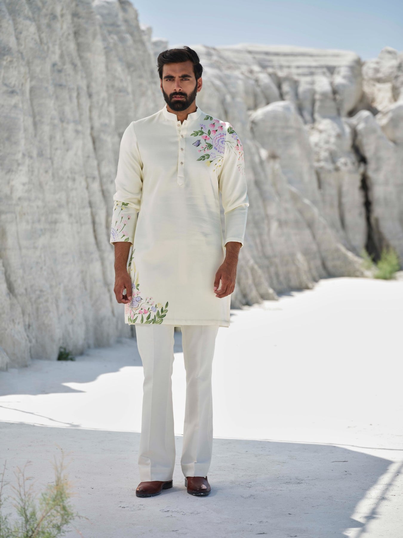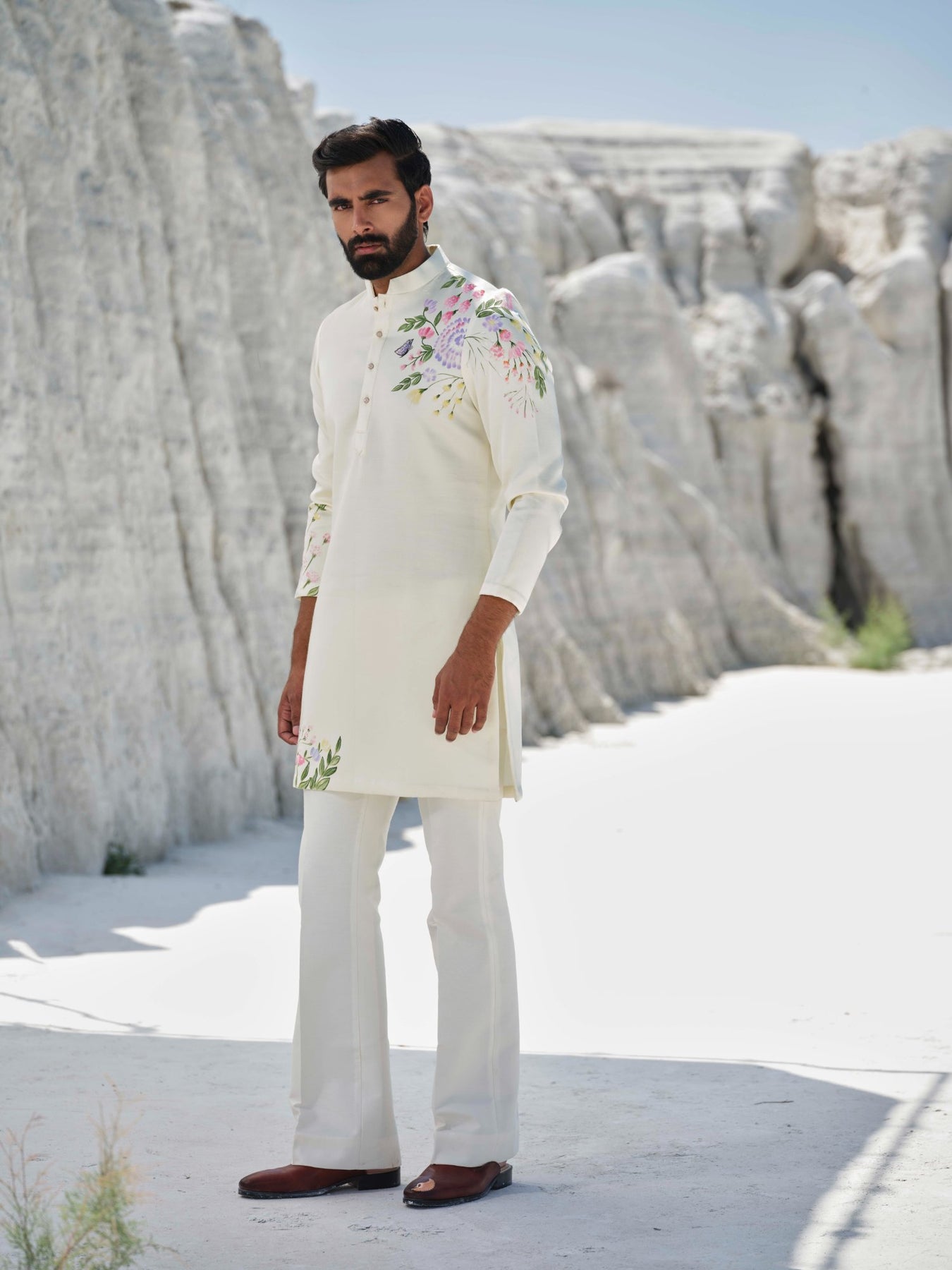 Butter Yellow Kurta With Hand-Painted Floral Artwork On The Shoulder, Sleeve, And Hem Paired With Ivory Bell Bottom Trousers