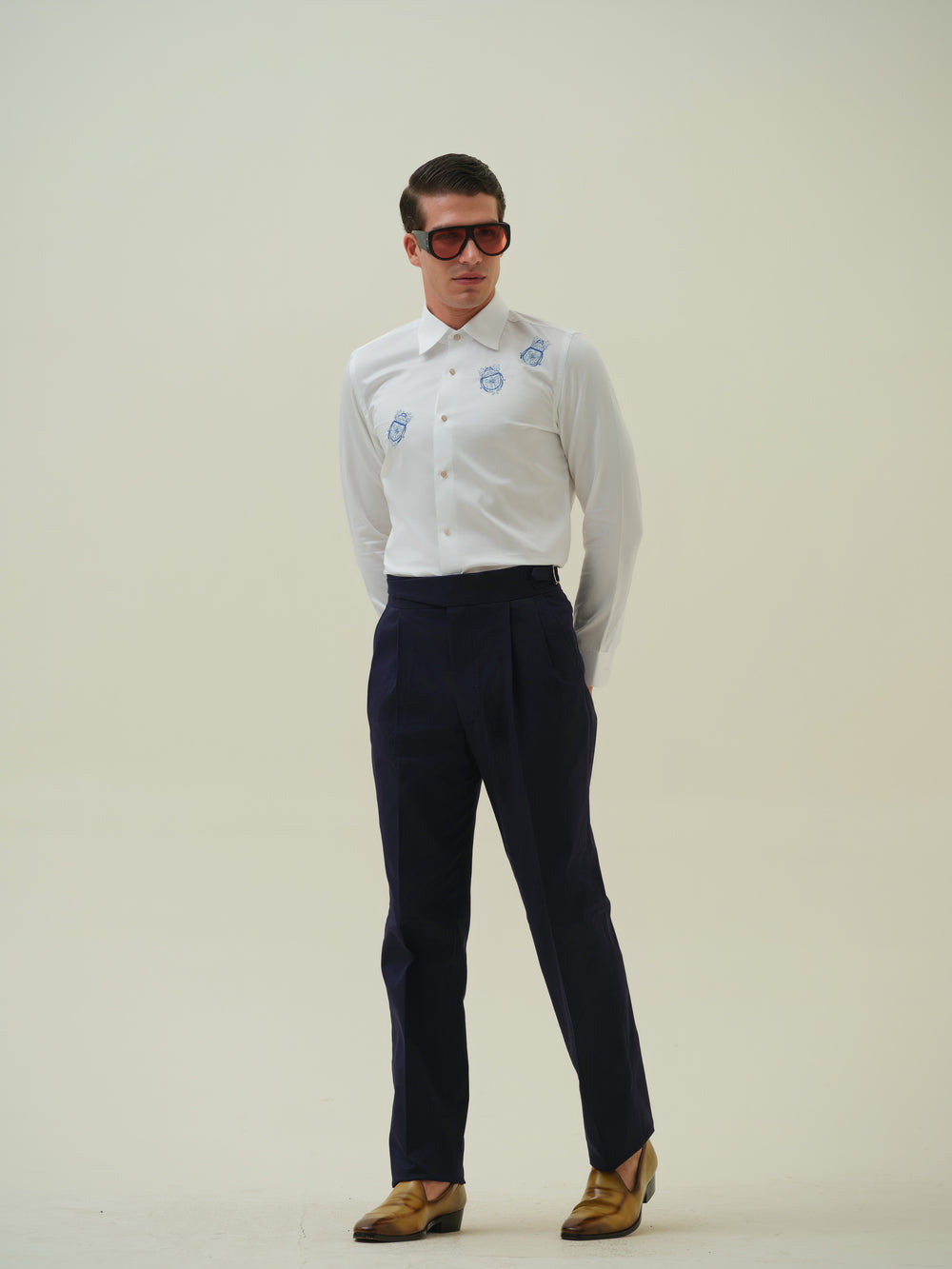 A white shirt featuring a detailed beetle motif embroidered in shades of blue.