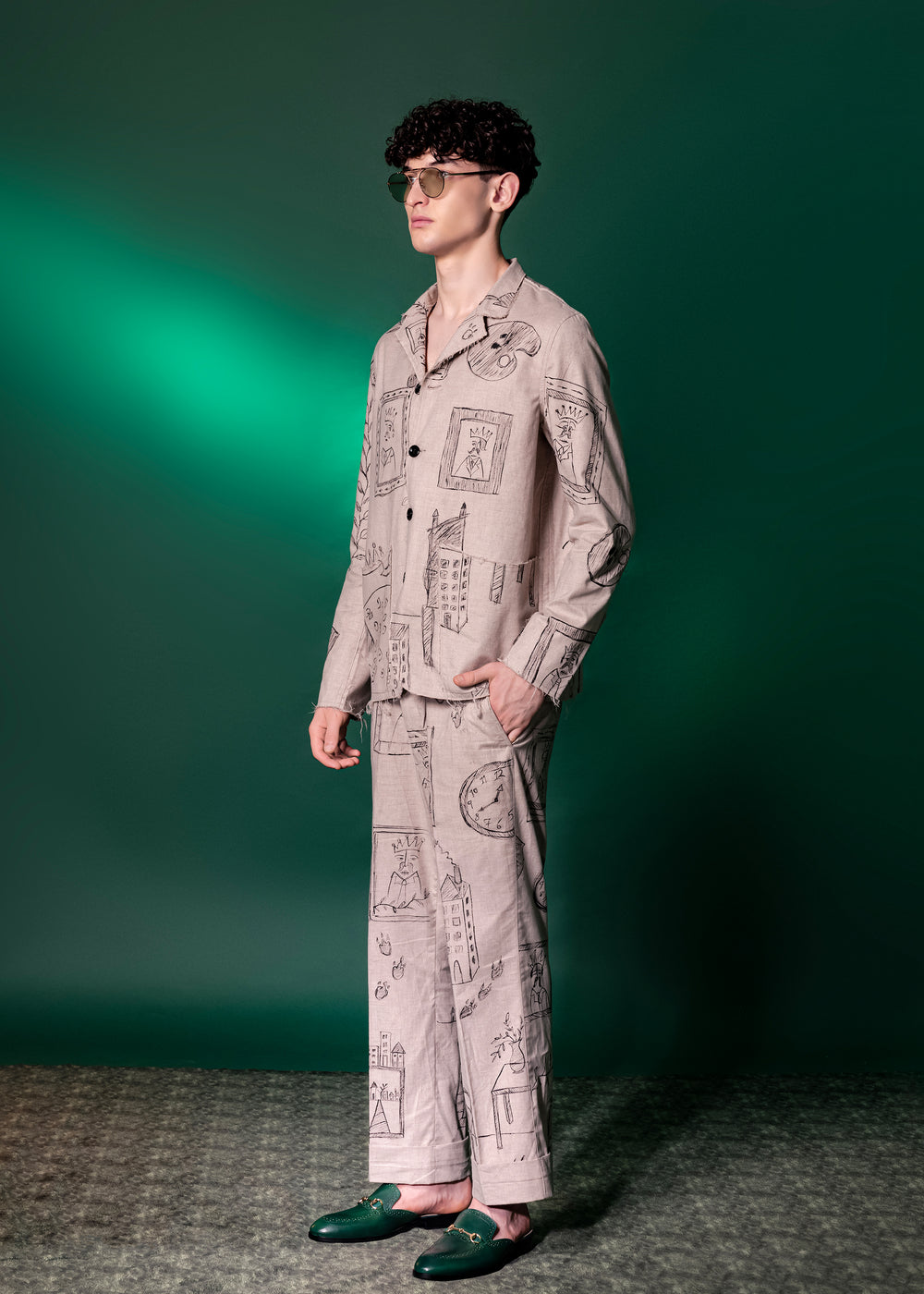 Featuring Beige Hand Painted Shirt In Tanzanian Linen Fabric. It is paired with matching bottom.