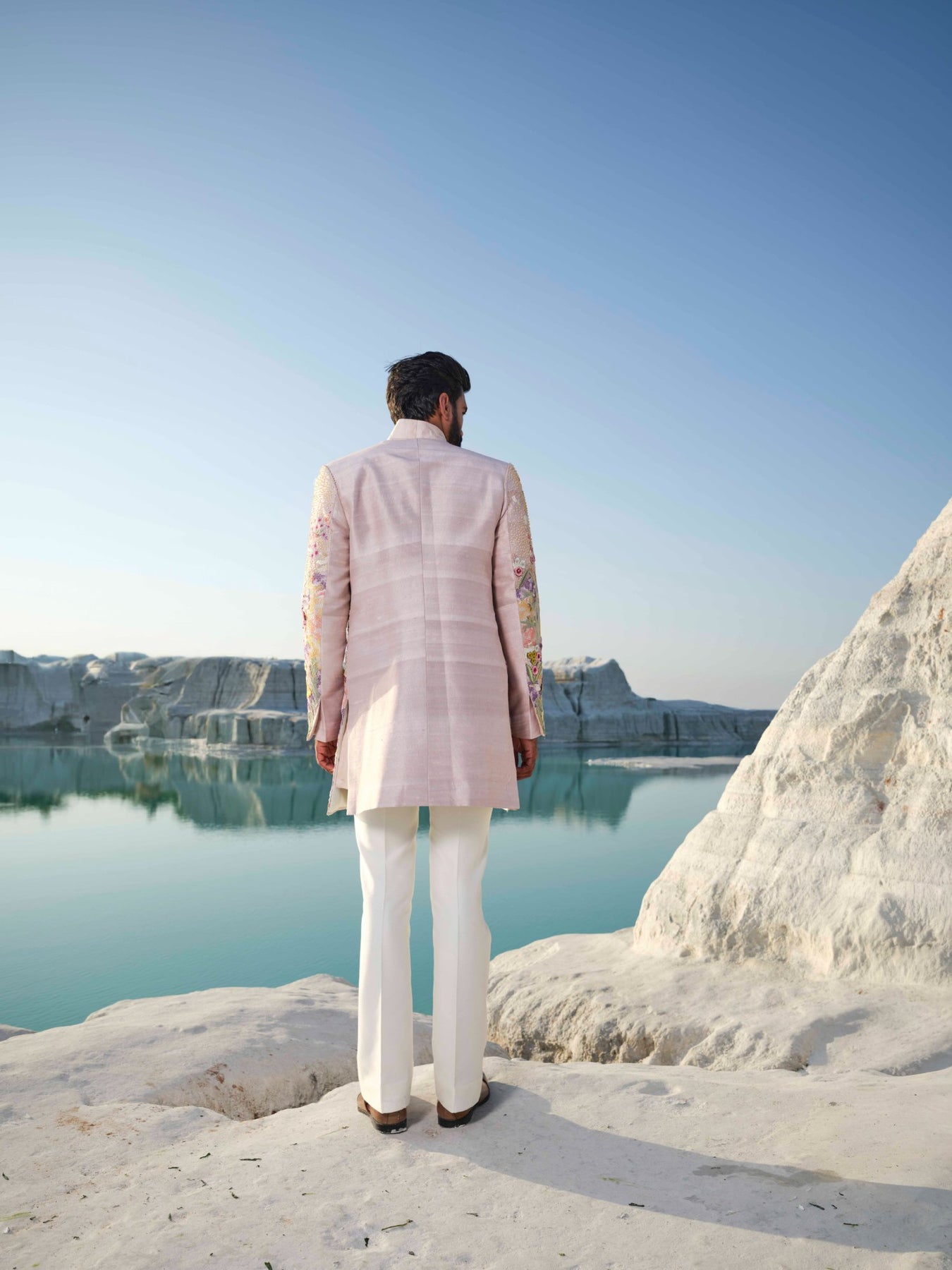 A Rosegold Jacket Adorned With Sequins, Threadwork And Beads Embroidered in Multi Colored Floral Motifs Paired With A Blush Toned Kurta And Ivory Bell Bottoms