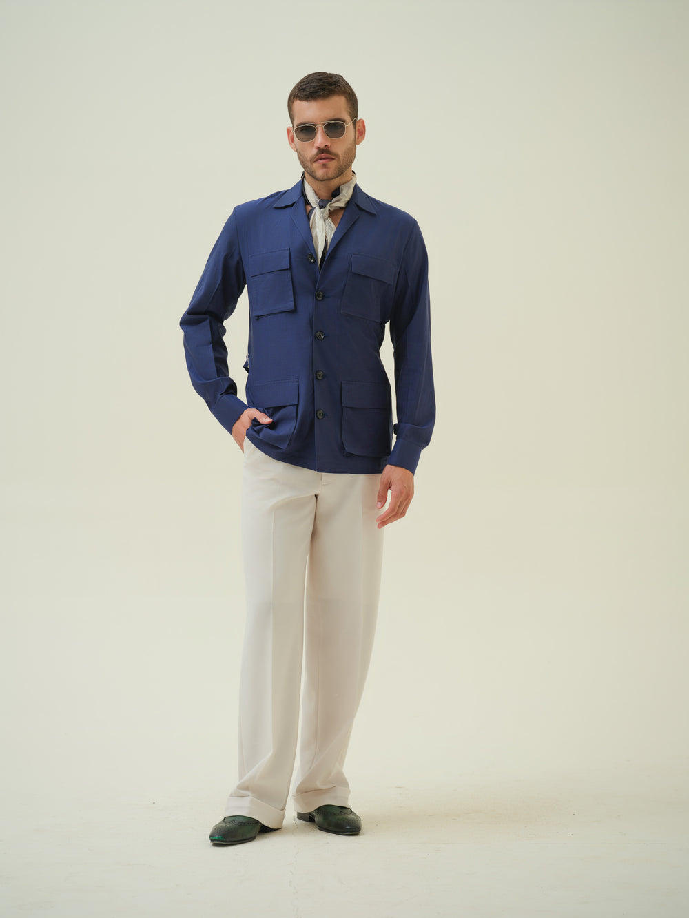 A blue Shacket with four functional pockets and a sleek back adjuster for a tailored fit.