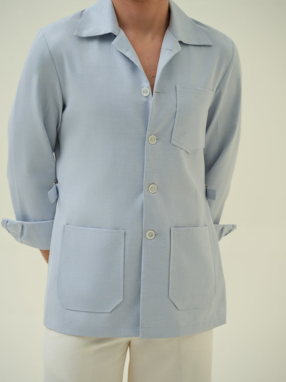 A structured blue shacket features three spacious pockets and a refined back adjuster for a tailored fit.