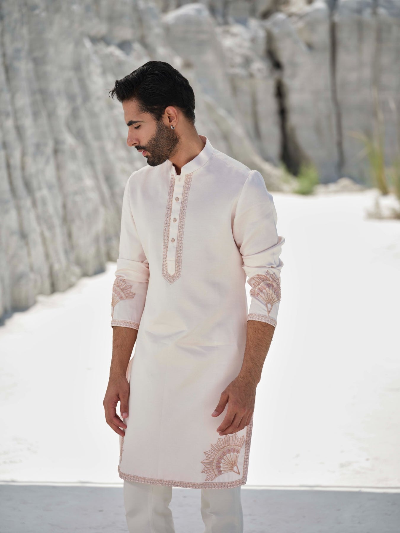 Blush-Toned Kurta Set Features Shell-Inspired Hand Embroidery With Cutpipe And ThreadOn Sleeves And Hem Paired With Ivory Trousers