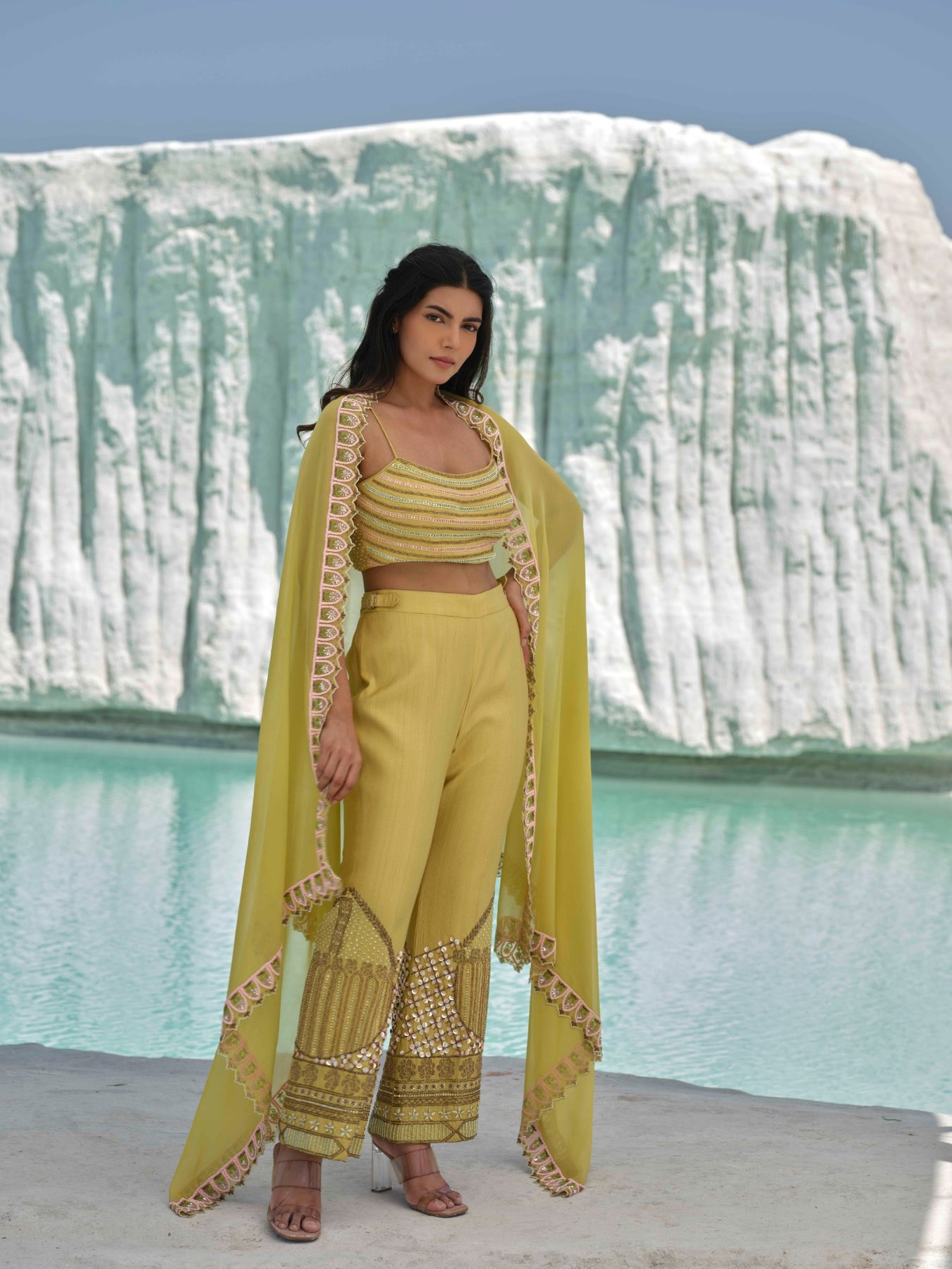 A Co-Ord Set Featuring A Crop Top, Flared Pants With Pearl And Thread Detailing, And A Flowing Cape Edged With Ornate Trims.