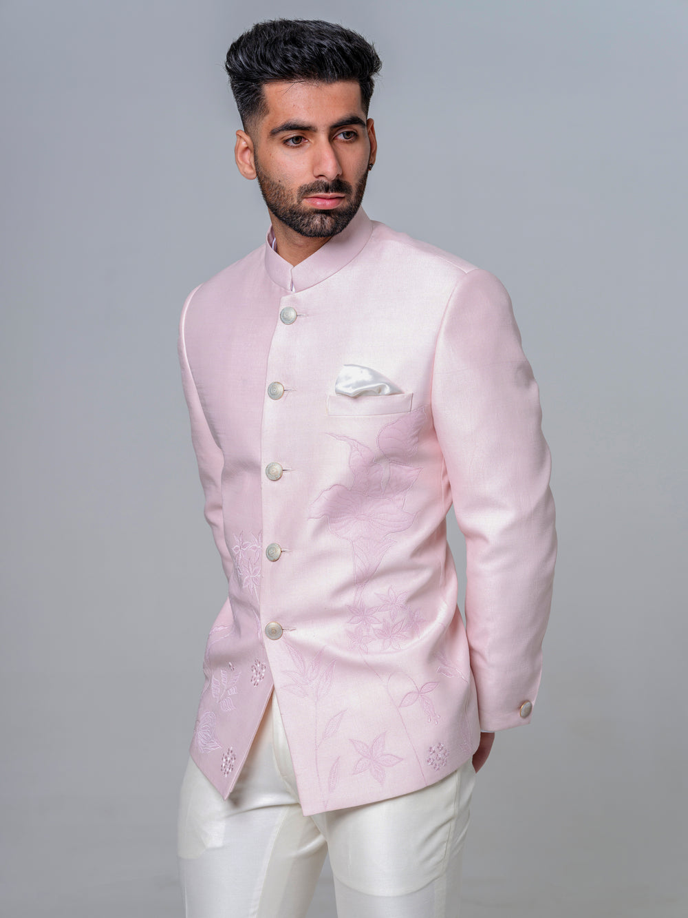 Pink Dupion Silk Classic Jodhpuri Enhanced with Self Toned Embroidered Motifs Styled with Chinese Collar Shirt and Black Trousers.