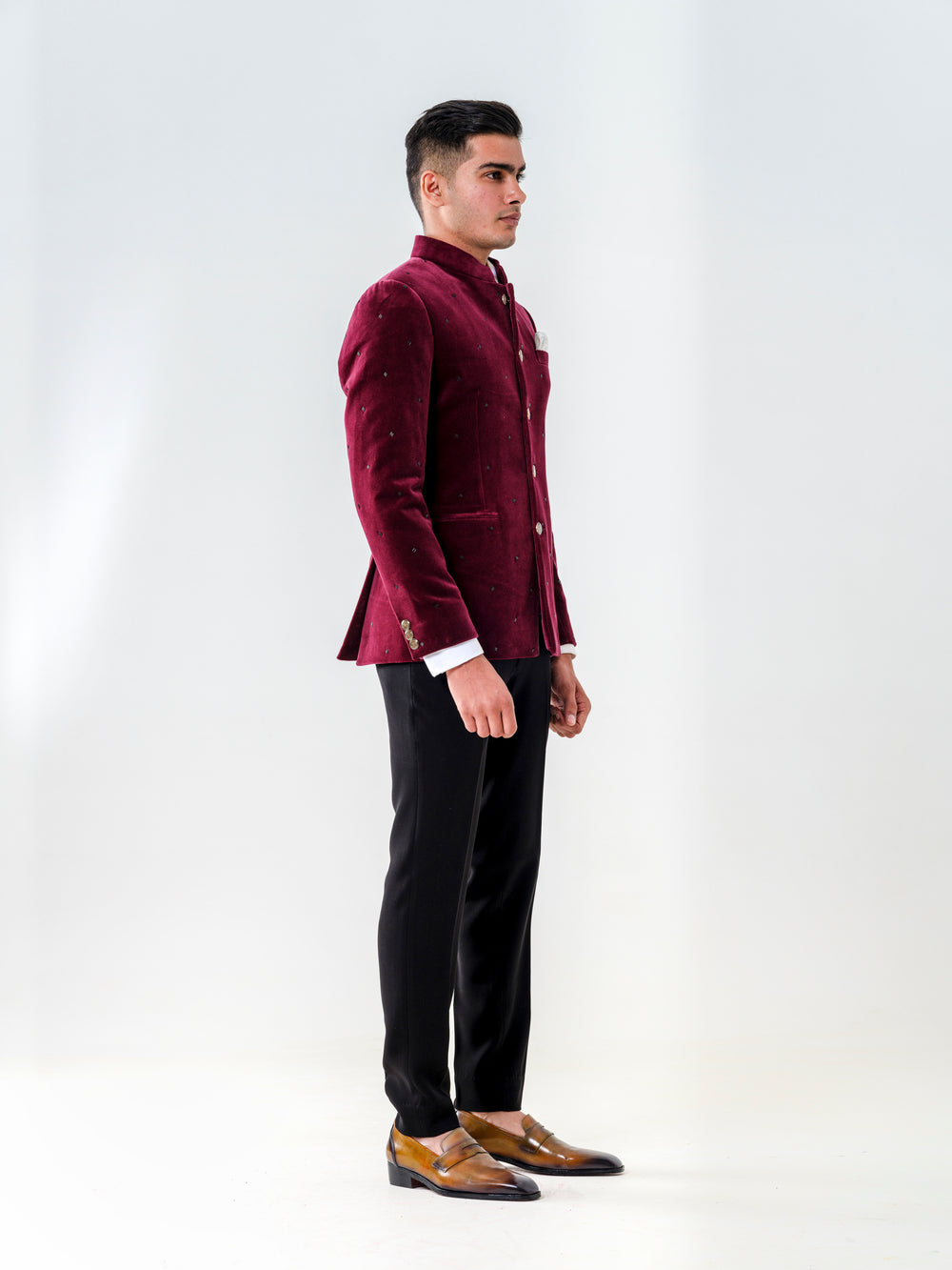 Mahroon Velvet Classic Jodhpuri Enhanced with Sprinkles of Cut Dana Styled with Chinese Collar Shirt and Black Trousers.