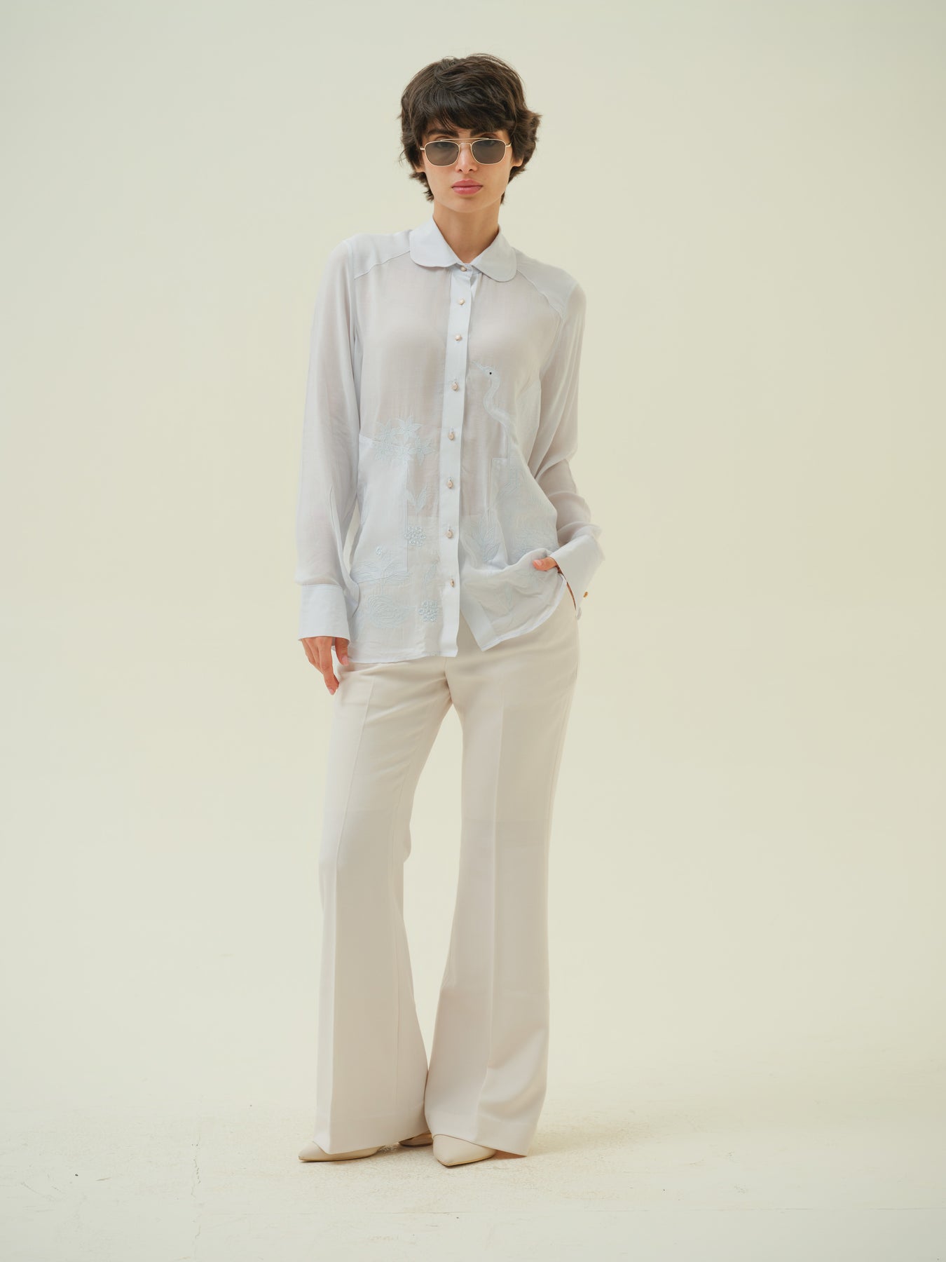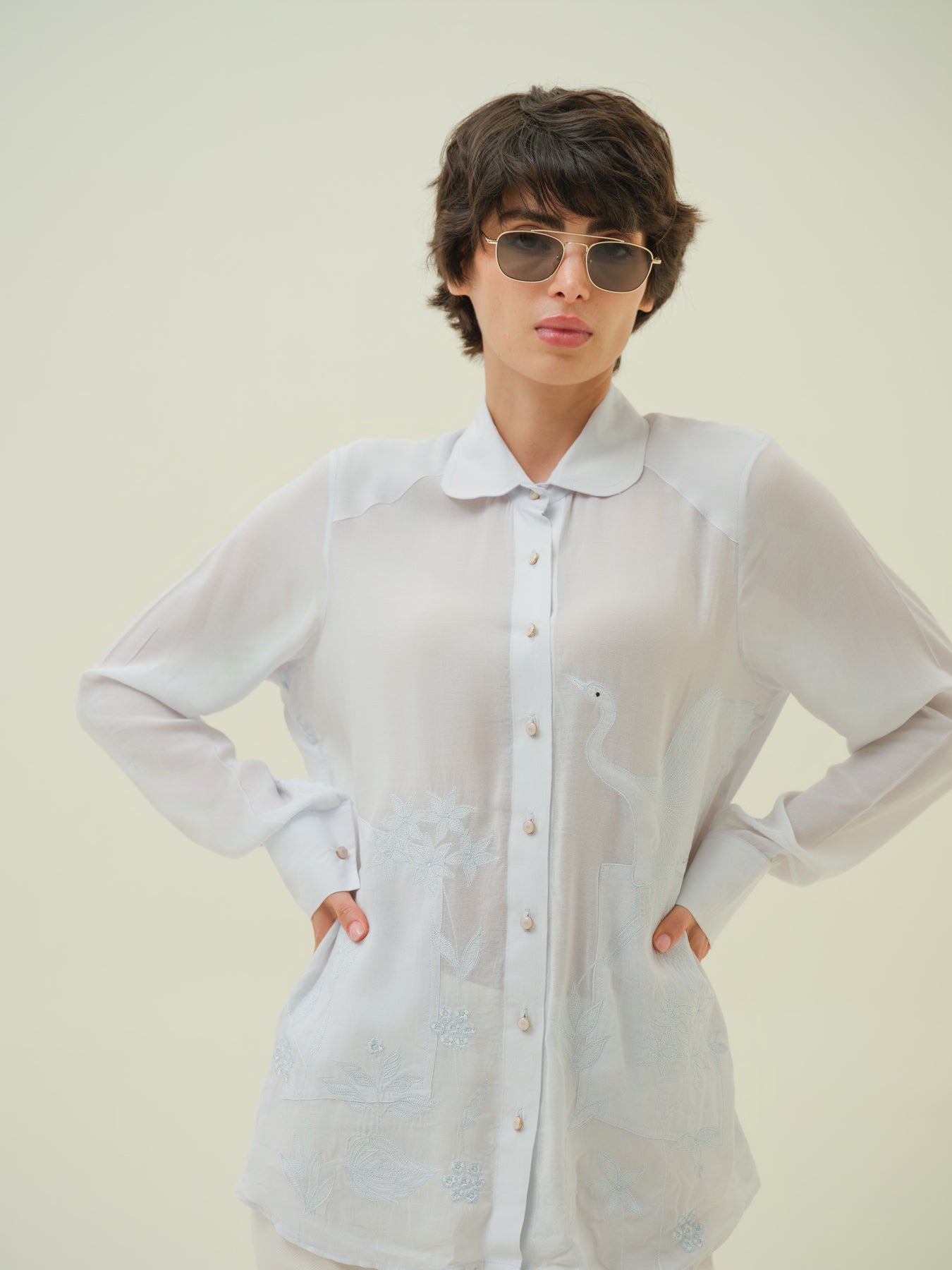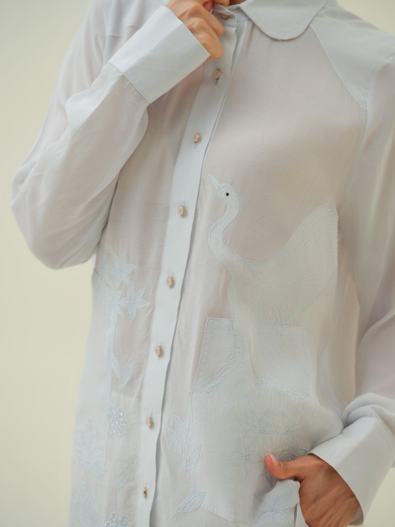 A light blue shirt with appliquéd flamingo and floral detailing.