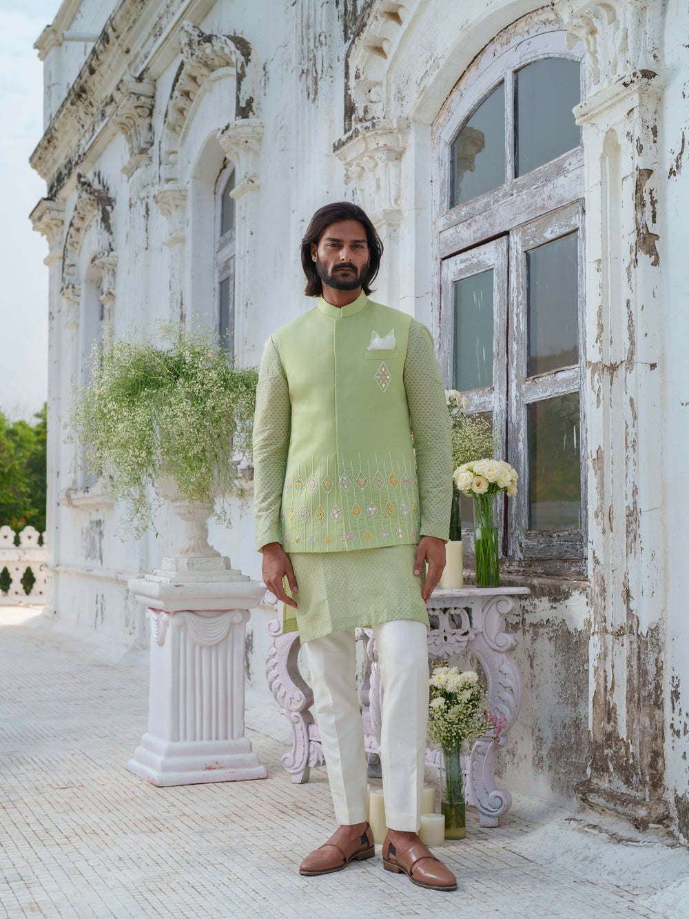 Featuring a green hand embroidered bundi jacket set, paired with a self chanderi kurta and trouser