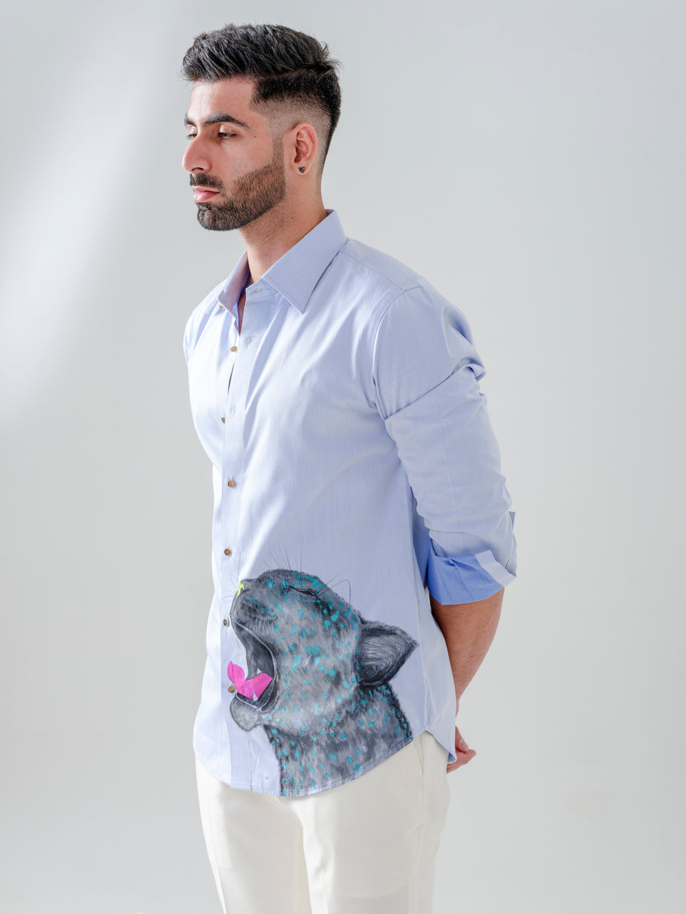 Light Blue Luxe Cotton Hand Painted Wolf Motif Shirt.