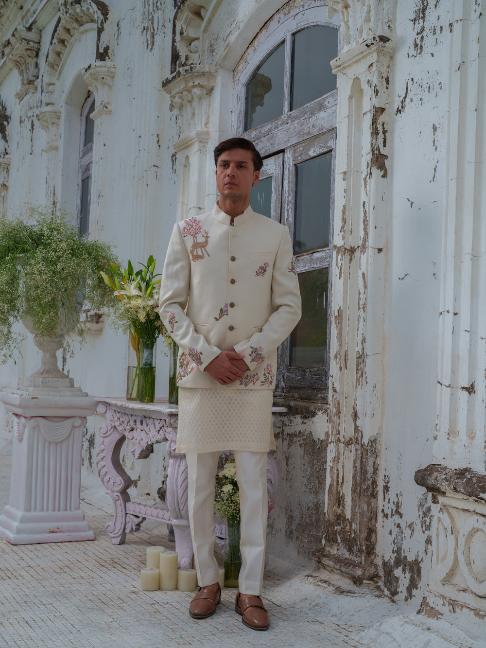 Featuring an ivory embroidered bandgala, paired with a kurta and trouser.