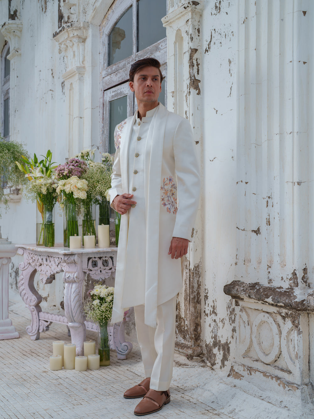 Featuring an ivory hand painted front open cape kurta, paired with a trouser.