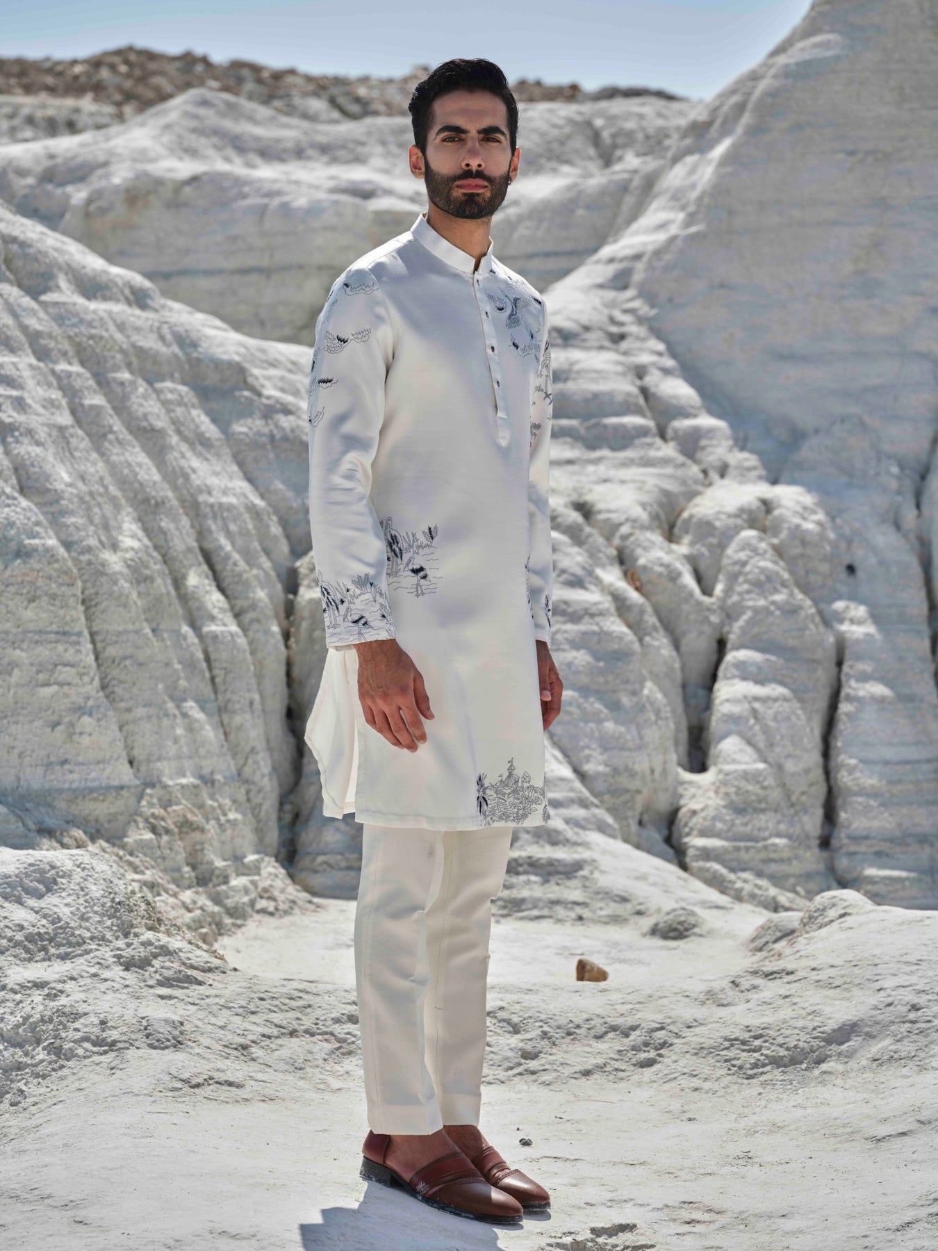 Ivory Kurta Adorned With Subtle Monochrome Threadwork On The Shoulder, Sleeves, And Hem, Paired With Matching Ivory Trousers.