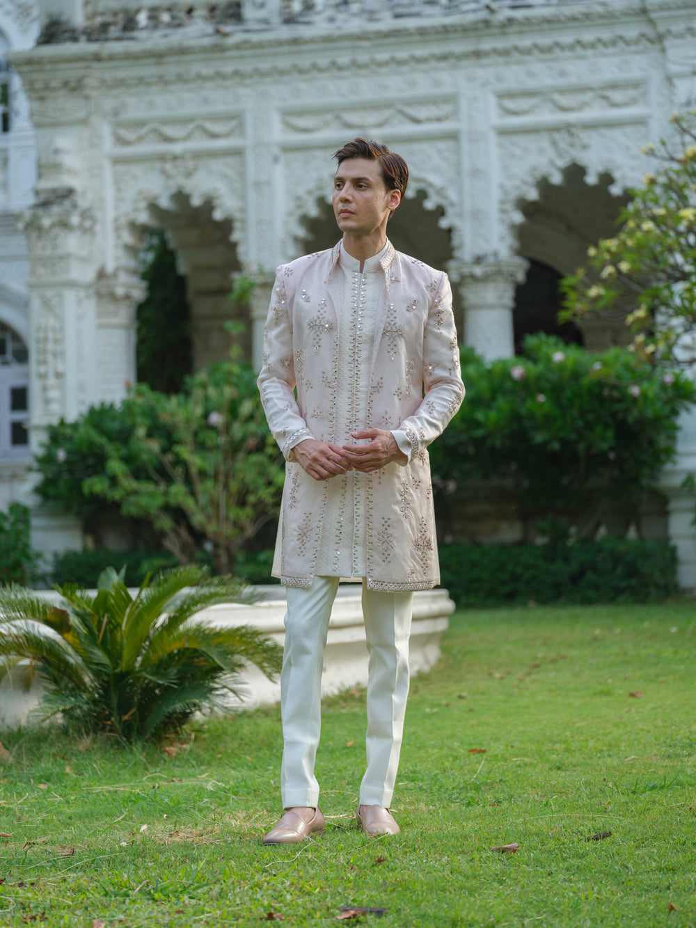 Featuring a light pink mirror work open organza jacket, paired with a self texured kurta and trouser.