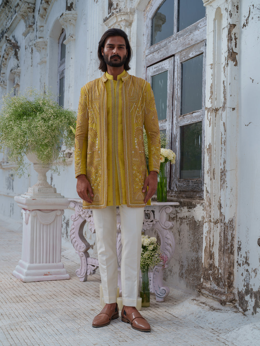 Featuring a lime green hand embroidered organza jacket, paired with a kurta and trouser.