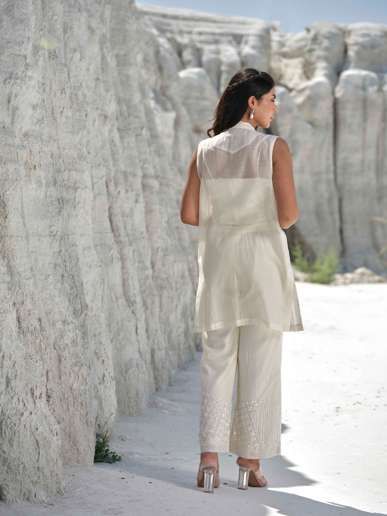 An Ivory Co-Ord With A Cropped Embroidered Blouse And Wide-Leg Pants Detailed With Geometric And Floral Threadwork At The Hem, Paired With A Sleeveless Long Jacket Featuring Vertical Embroidered Panels.