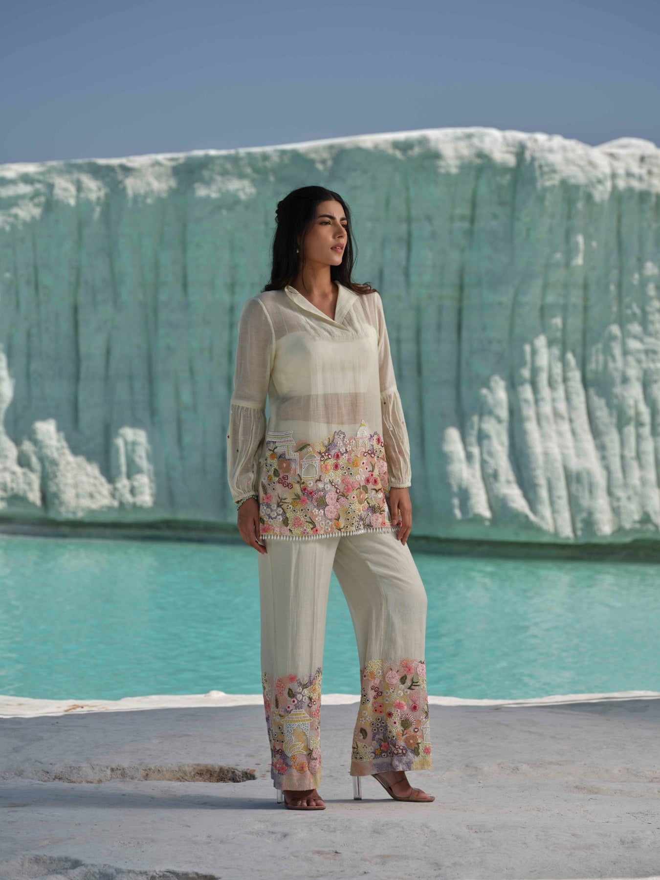 A Pastel Co-Ord Set Featuring A Longline Tunic With A Soft Collar And Full Sleeves, Paired With Straight Pants Adorned With MulticolorFloral Hand Embroidery. Paired With A Satin Bustier