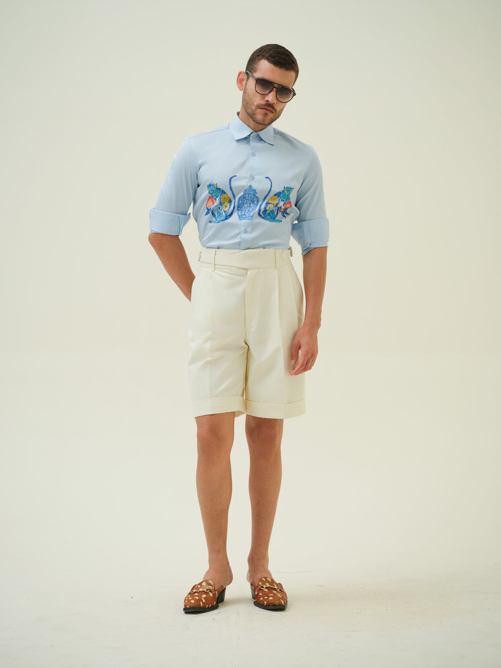 A blue hand-painted shirt featuring playful monkeys and a jar motif.