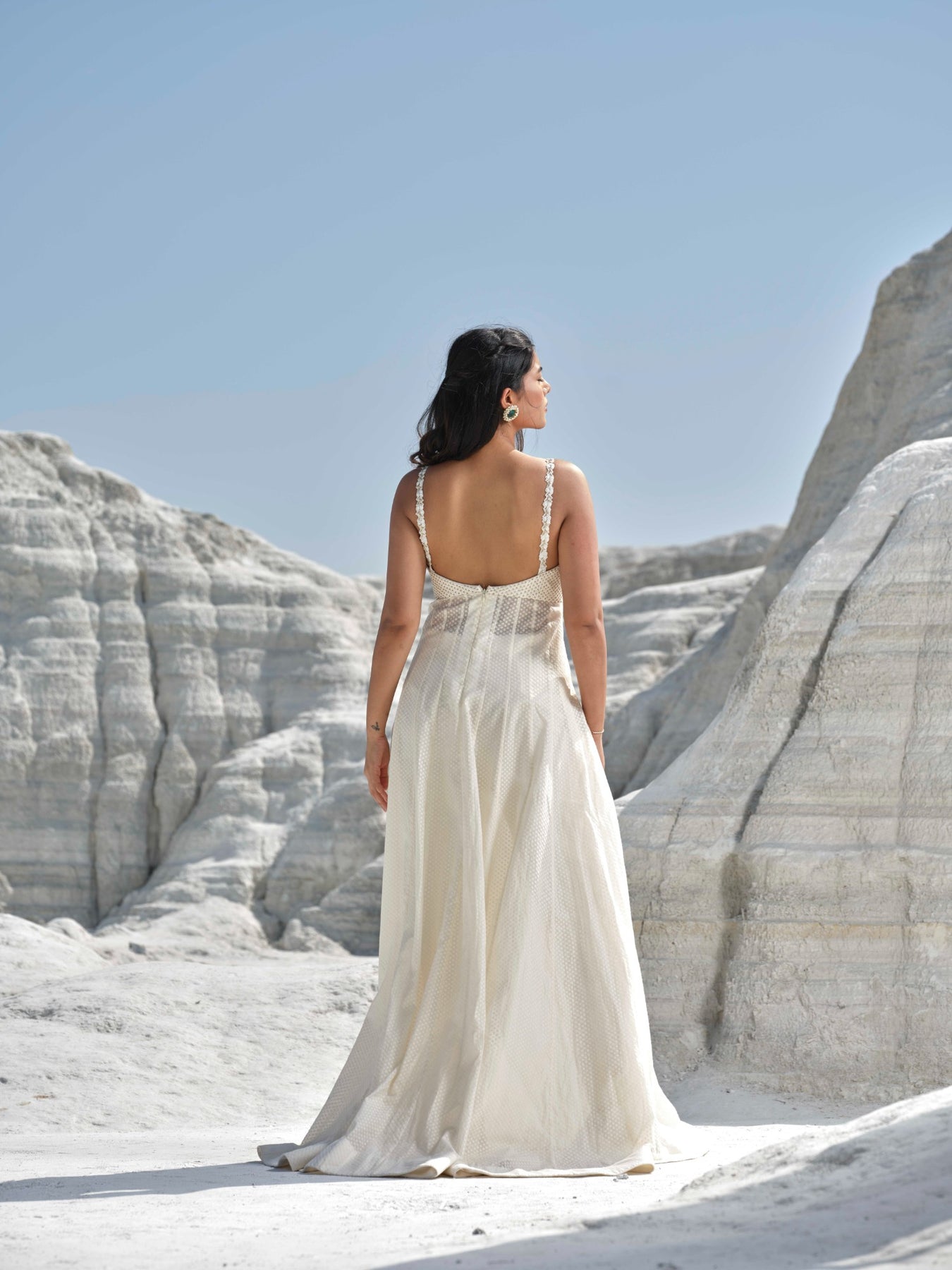 An Ivory Gown With A Pearl-Adorned Bodice, Delicate Cutwork Beaded Straps, Paired With An Ivory Pants.