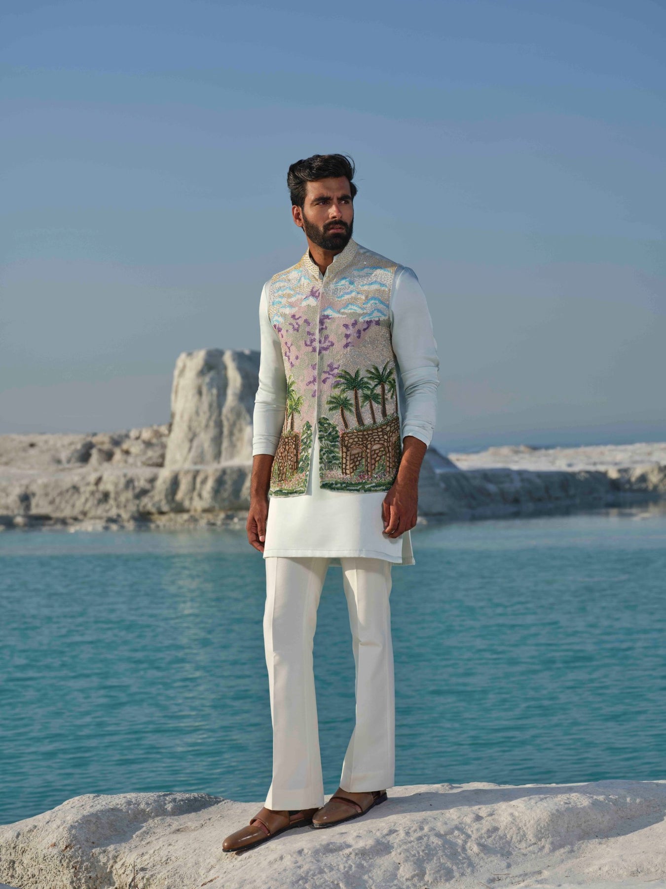 Featuring A Light Sea Green Bundi Set Along With Handpainted And Hand Embroidered Motifs Of Palm Trees, Mountains, And Birds On A Pastel Base Paired With Ivory Bell Bottoms and Kurta.
