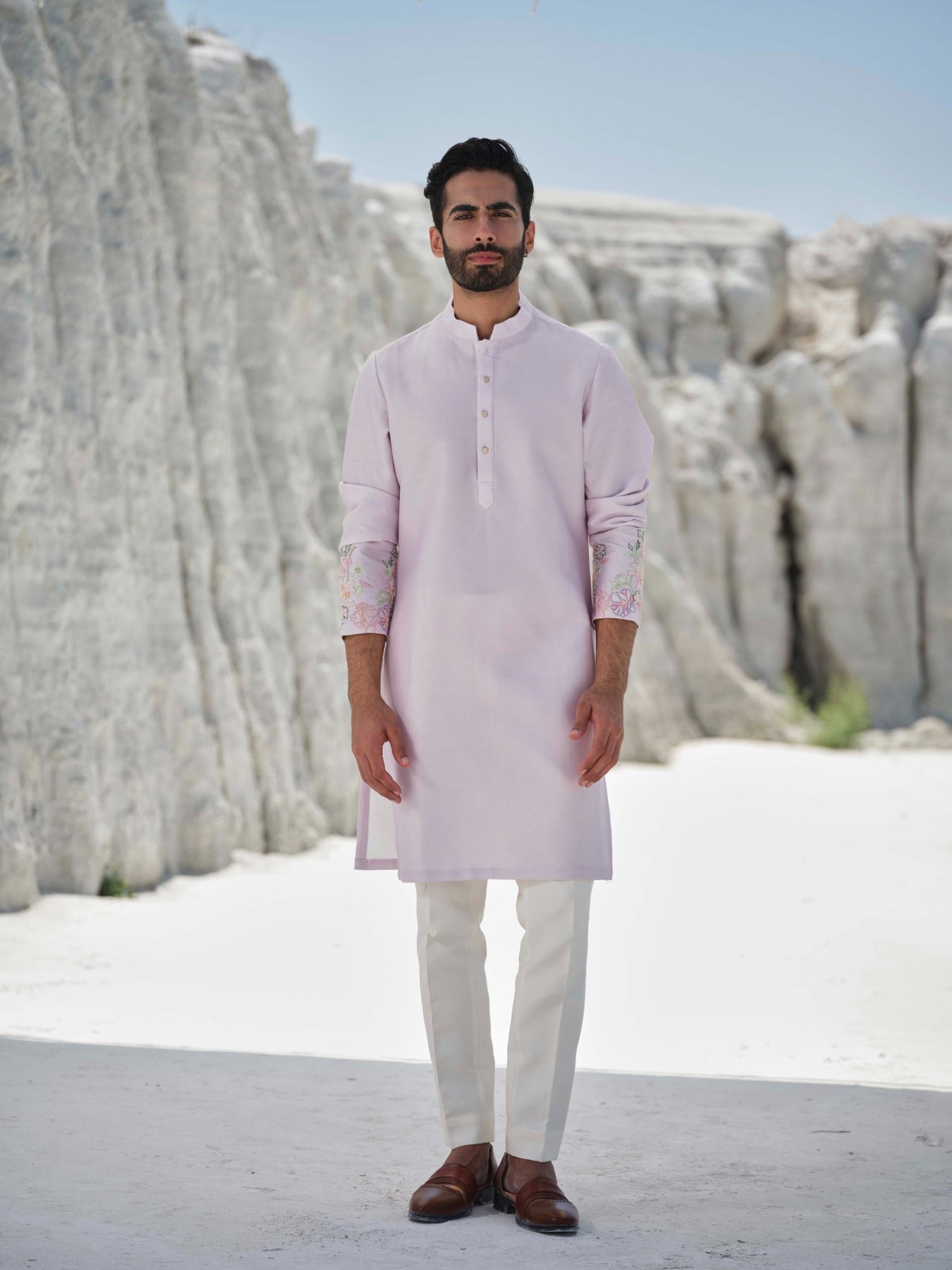 Lilac Kurta Featuring Subtle Floral Bead Embroidery On The Cuffs Paired With Ivory Trousers