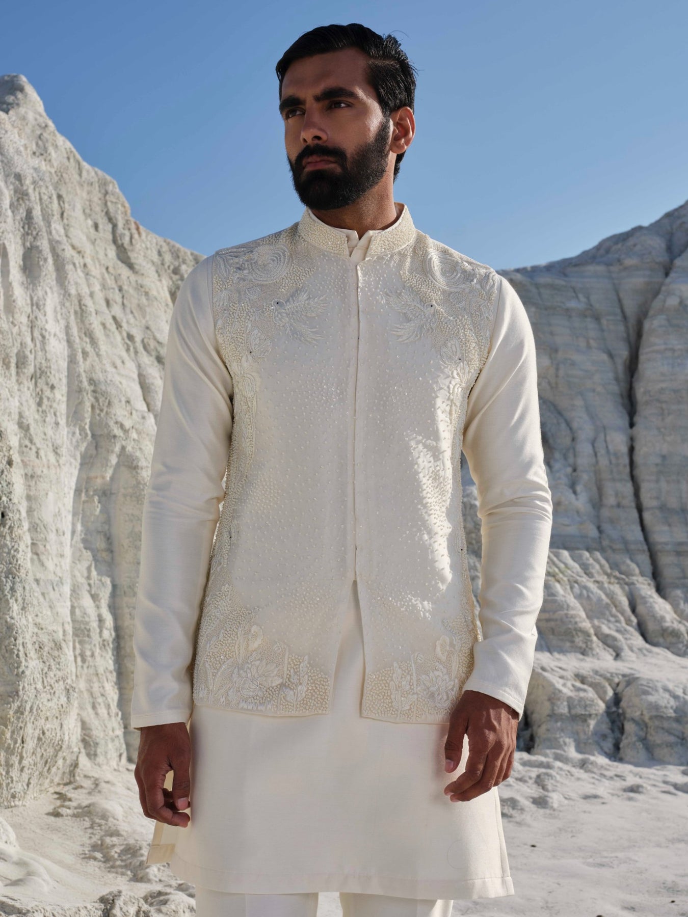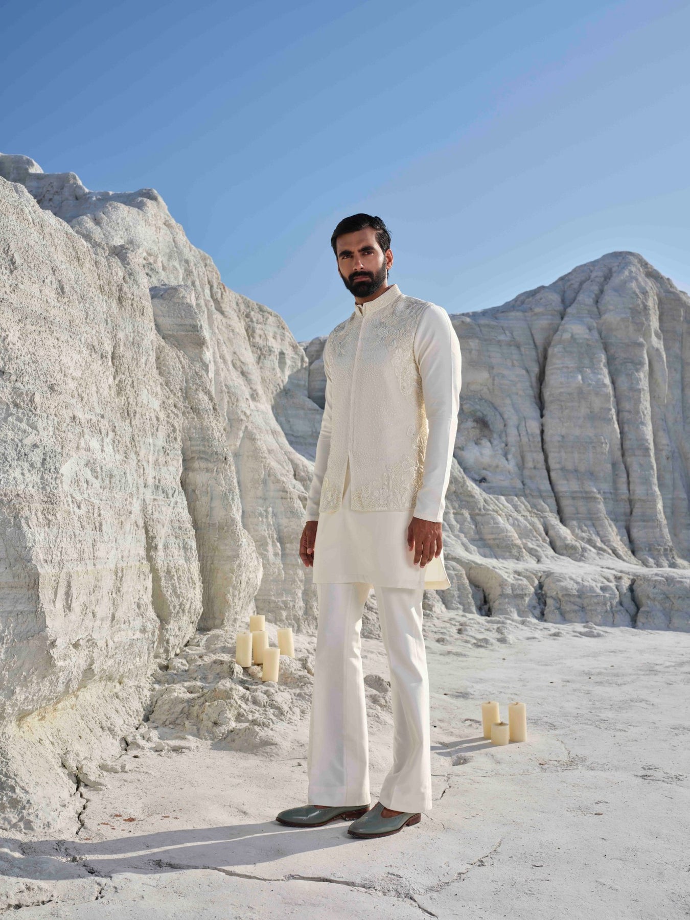 The Bundi Features Delicate Tonal Embroidery And Beadwork Along With Monochrome Palette And Subtle Detailing Paired With Ivory Bell Bottoms And Kurta