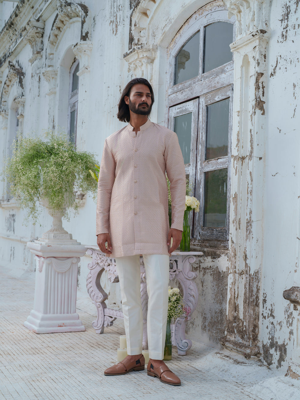 Featuing a pink self textured front open kurta, paired with a trouser.