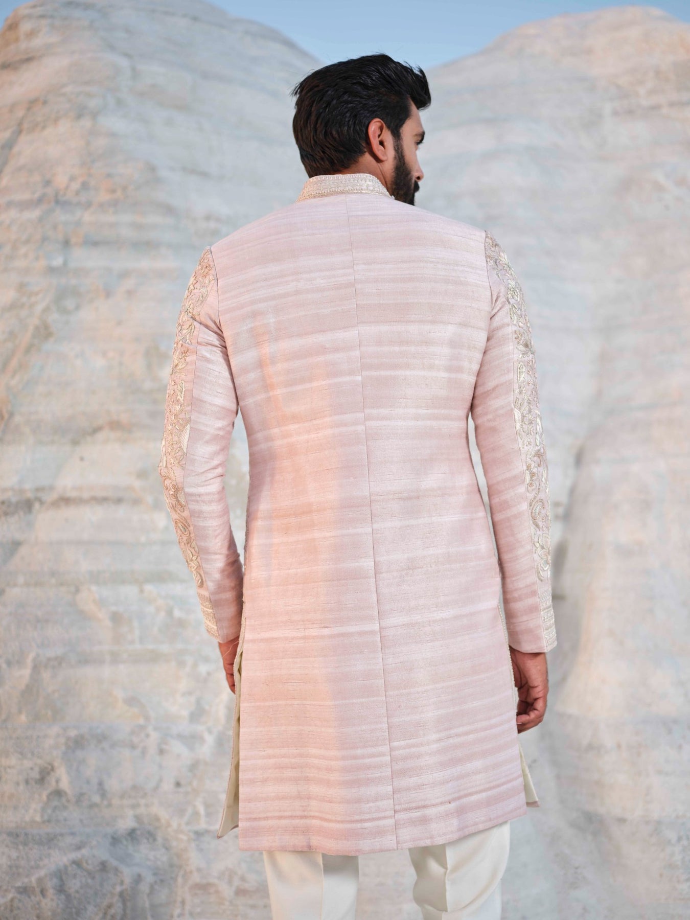 Rosegold Sherwani Featuring Intricate Resham And Zari Detailing In Floral Patterns Paired With Ivory Trousers And Kurta