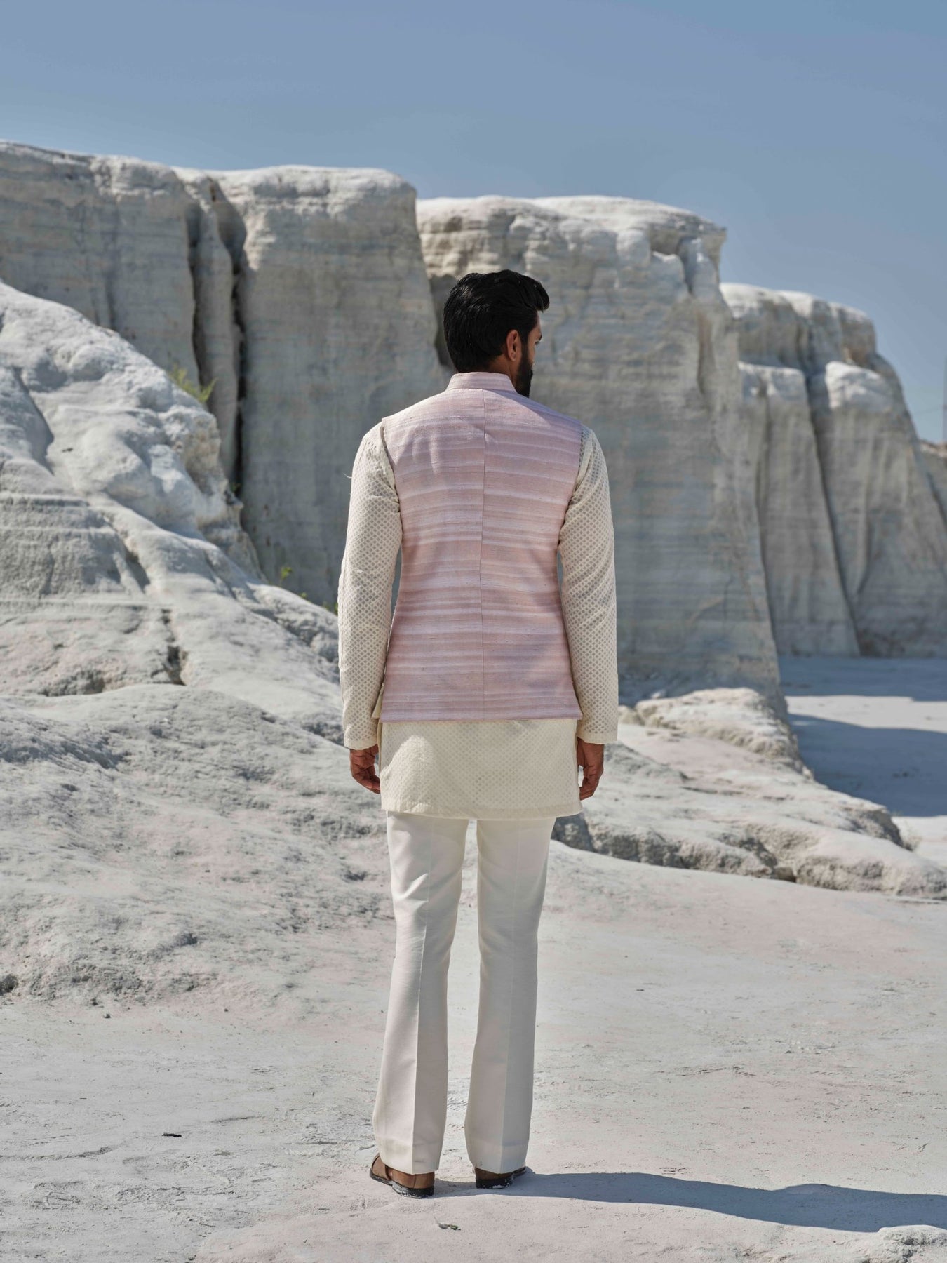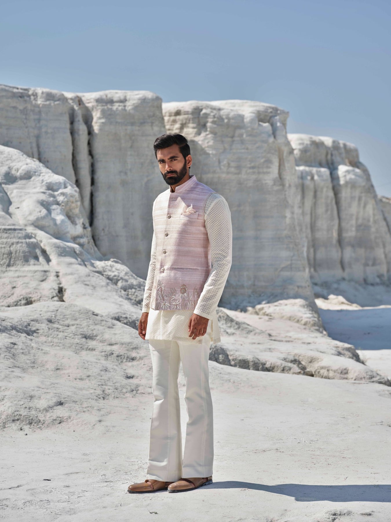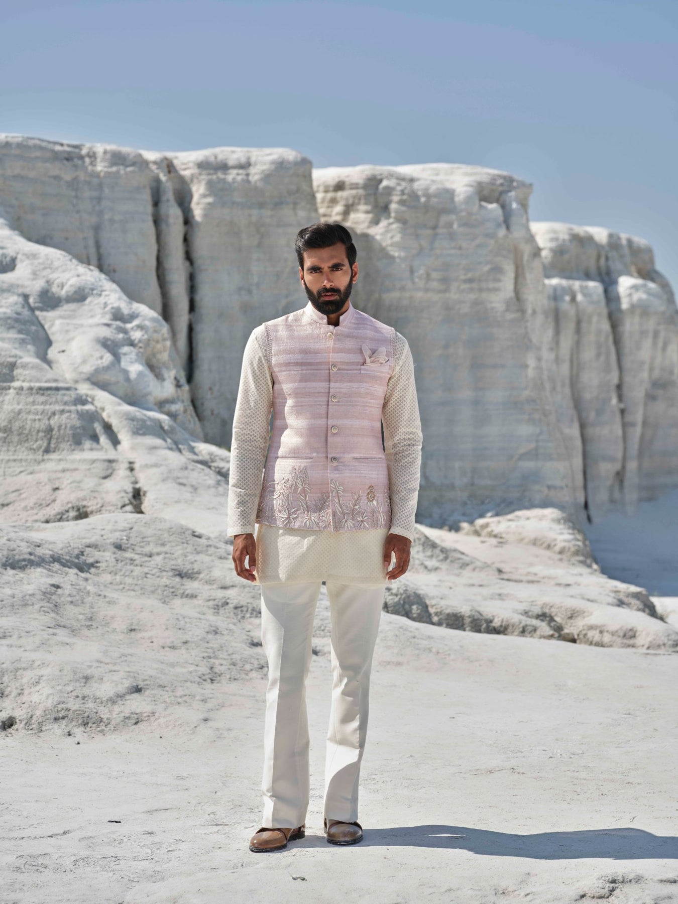 A Rosegold Bundi Paired With Ivory Kurta, Pocket Square And Bell Bottoms Featuring Delicate Thread Embroidery Along The Hem