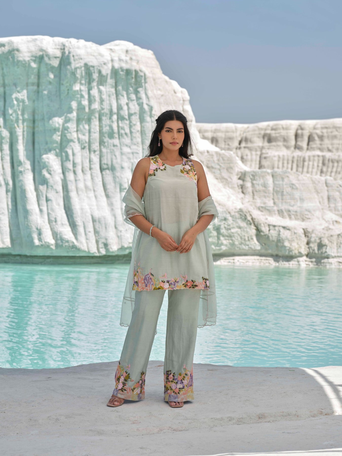 A Sage Green Three-Piece Outfit Adorned With Intricate Floral Embroidery Along The Neckline, Hem, And Trouser Cuffs. The Straight-Cut Kurta Is Paired With Relaxed Pants, Both Detailed With Blossom Motifs.