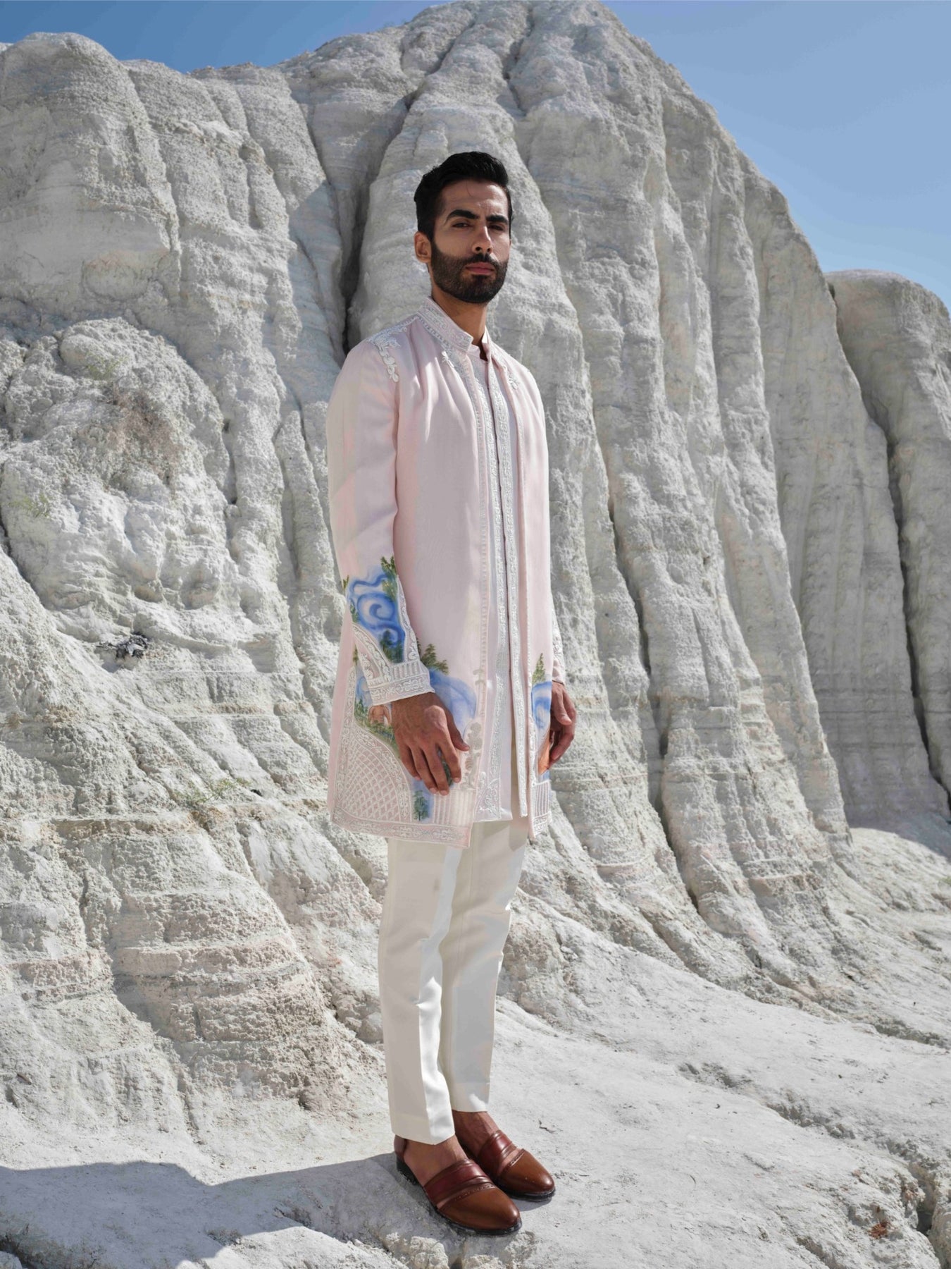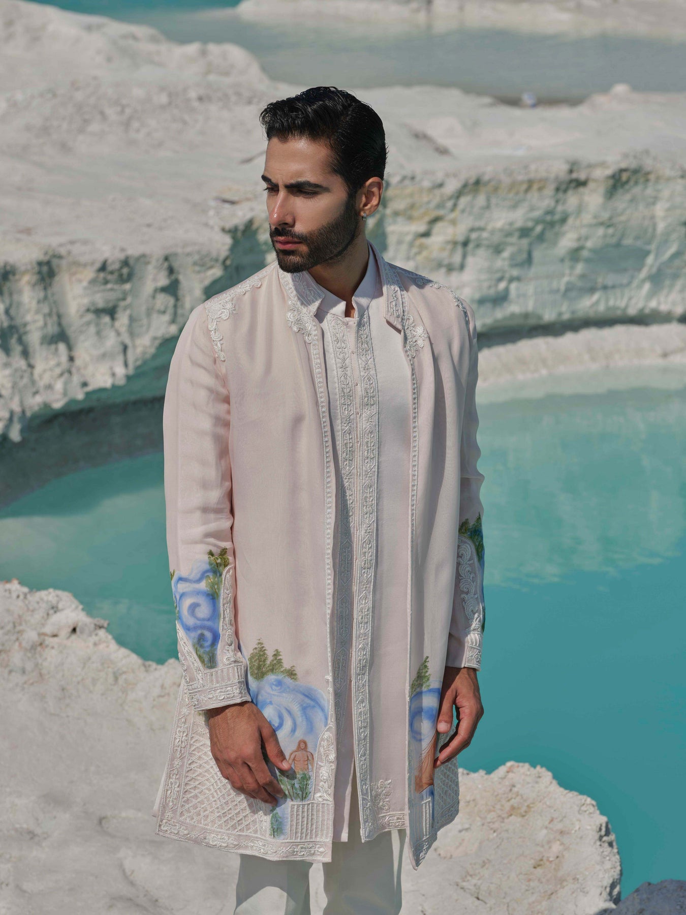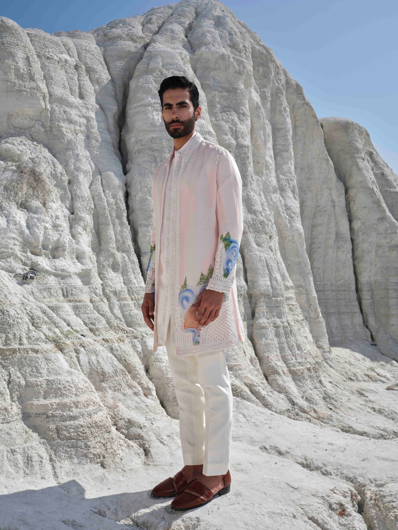 A Soft Blush Open Jacket With Painterly Strokes Of Blue And Green Detailed Pearl Embroidery Frames Paired With Pearl Embroidered Kurta And Ivory Trousers
