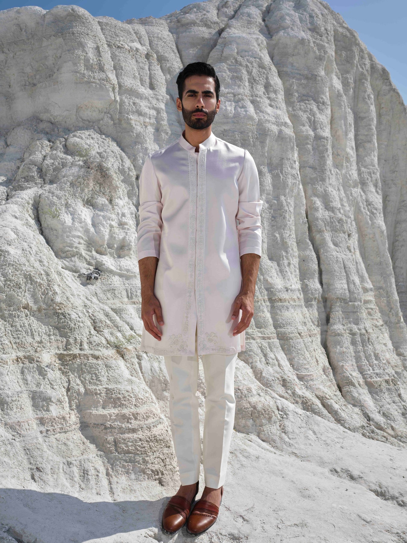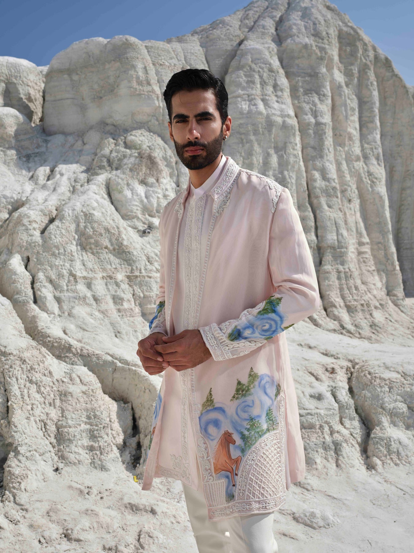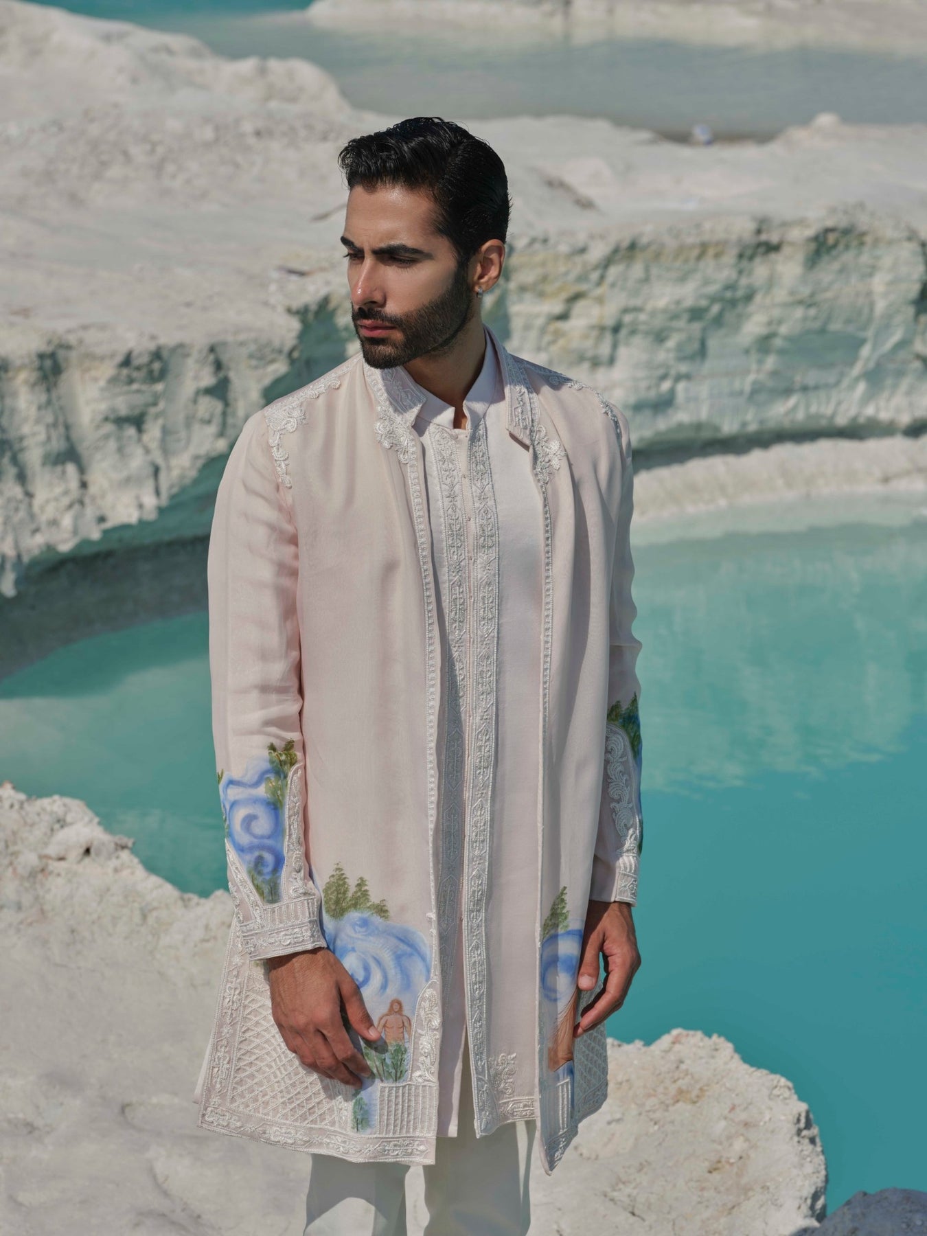 A Soft Blush Open Jacket With Painterly Strokes Of Blue And Green Detailed Pearl Embroidery Frames Paired With Pearl Embroidered Kurta And Ivory Trousers