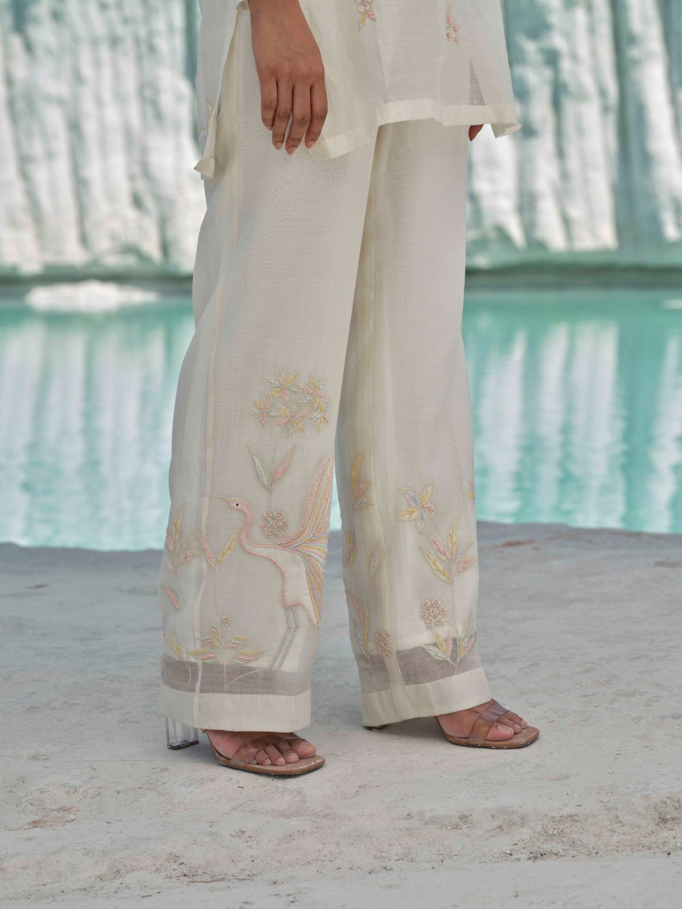Light Two-Piece Set Featuring Embroidery Of Soaring Birds And Blooming Florals. Kurta With Sheer Sleeves And Pastel Threadwork Straight Pants Are Detailed With Intricate Motifs Along The Hem