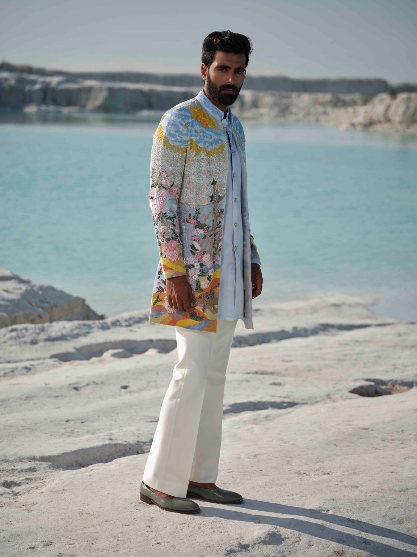 This Jacket Features Sequin Thread And Bead Embroidered In Hues Of Gold, Blue, And Blush Evoking A Scenic Sunrise Over Rolling Landscapes Paired With Ivory Bell Bottoms. And Kurta