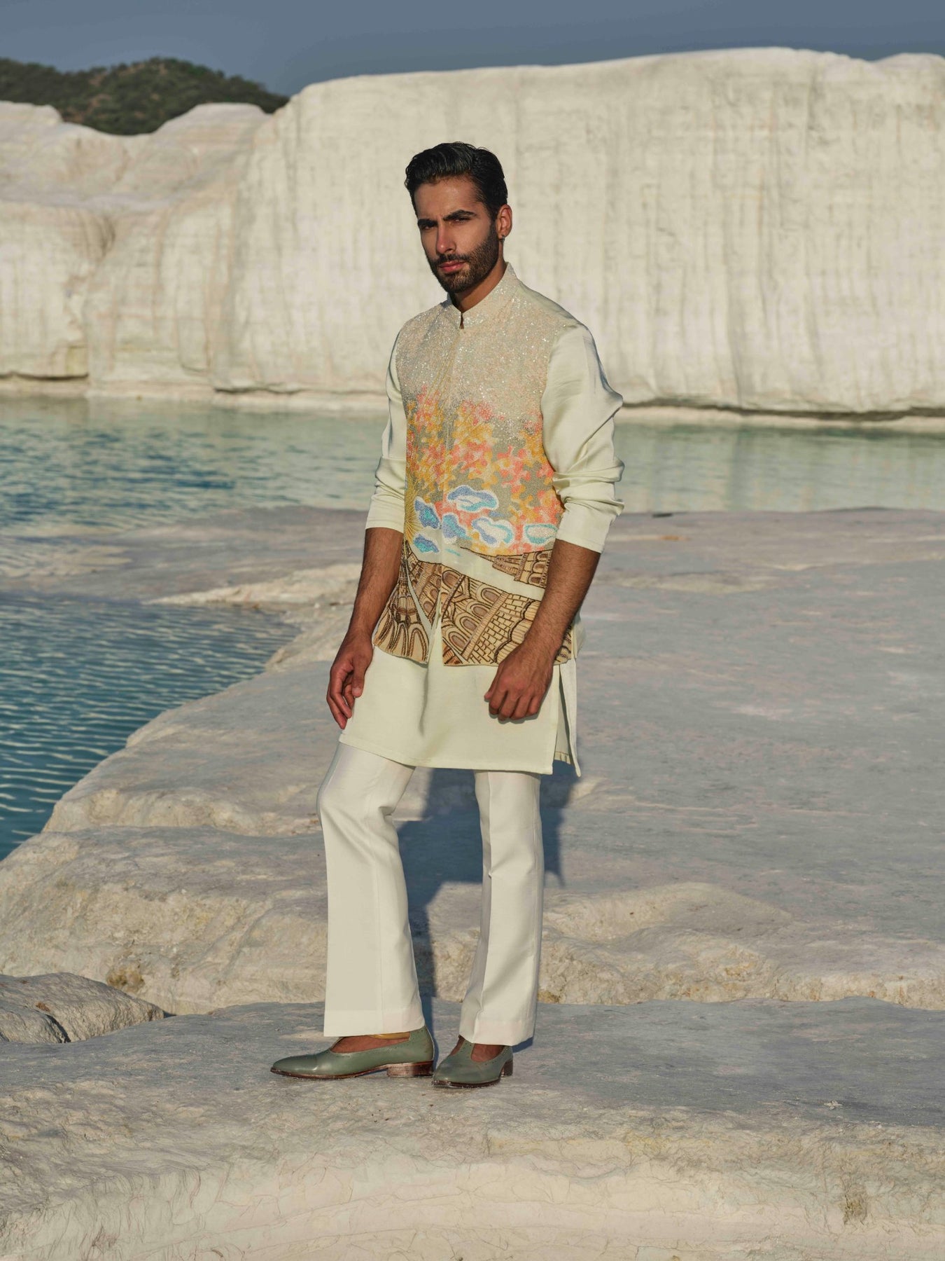A Light Green Bundi Jacket Adorned With Handpainted Architectural Motifs Embellished with Bead And Cutpipes At The Hem And A Burst Of Vivid Sunset Hues Across The Chest Paired With Kurta And Trousers.