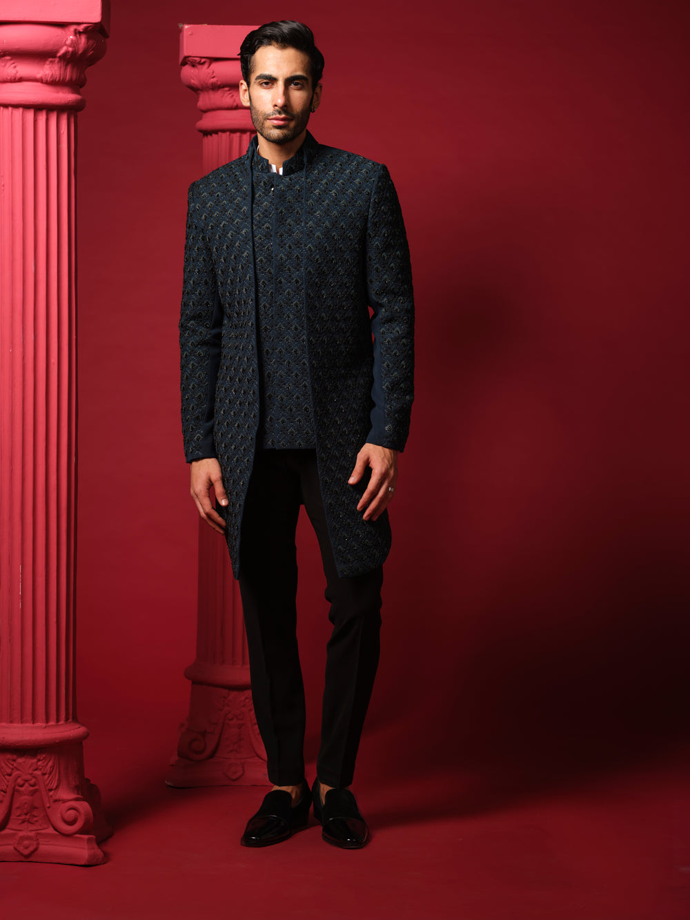 Elevate your style with the Teal Enchantment Indo-western Set. This teal green jacket over jacket features exquisite allover resham, cutpipes, and bead embroidery, paired seamlessly with a shirt and trousers. Ideal for a sophisticated and eye-catching look.